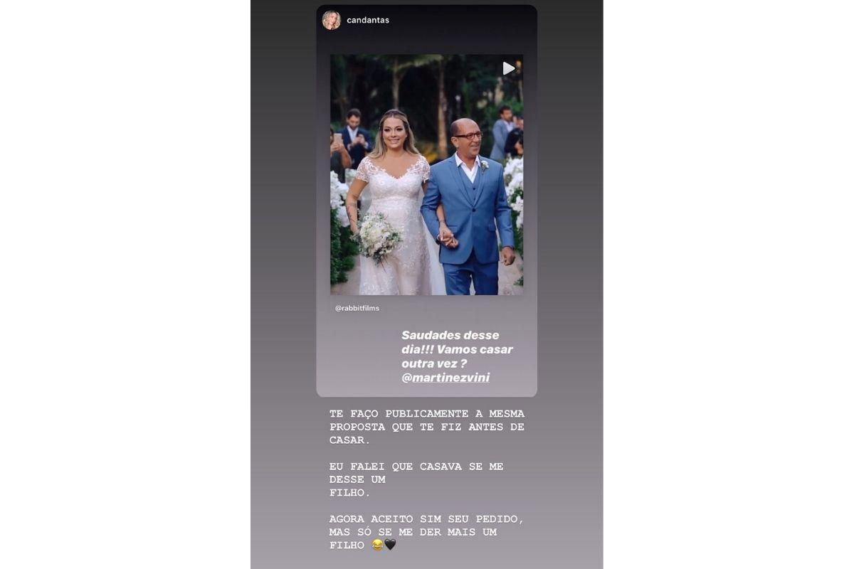 Nos stories, Carol Dantas compartilhou um vídeo do casamento dos dois e o marido repostou o momento dizendo: “Te faço publicamente a mesma proposta que te fiz antes de casar. Eu falei que casava se me desse um filho. Agora aceito, sim, seu pedido, mas só se me der mais um filho”, brincou Vinicius pela rede social.