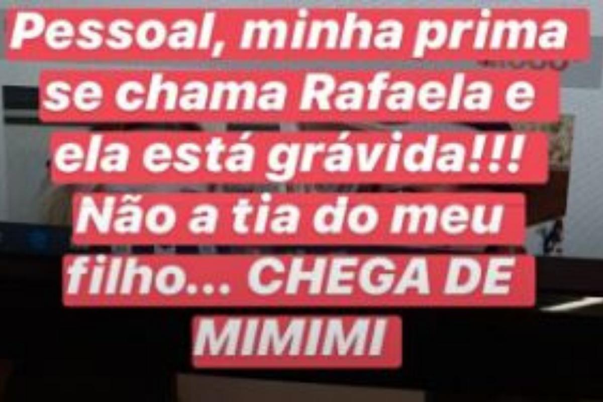 Porém, uma seguidora deixou um comentário que fez os seguidores ficarem confusos. “A Rafa vai estar assim”, disse a fã. Carol respondeu com bom humor, dizendo: “Vai mesmo”. Muitos seguidores acharam que a Rafa era Rafaella Santos, irmã de Neymar e ex-cunhada de Carol Dantas. Imediatamente, vários fãs começaram a perguntar se Rafaella estava grávida do jogador Gabigol. Rapidamente, Carol Dantas foi aos stories esclarecer o acontecimento. “Gente, minha prima que se chama Rafaela também, filha da minha tia Marta que fez o comentário, que está grávida, não é a Rafa tia do meu filho!”, explicou a influencer.