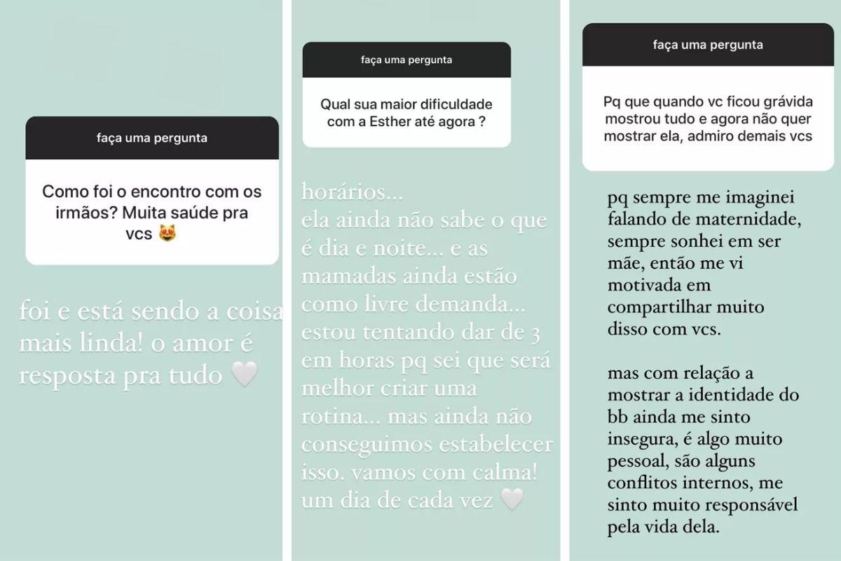 A mãe de primeira viagem também falou sobre como anda a amamentação da filha. “Sentiu dores para amamentar? Como foram os primeiros dias?”, perguntou um seguidor. A modelo admitiu que o processo foi doloroso no início. “Bem dolorido, machucou bem, mas com 12 dias já calejaram”, explicou.