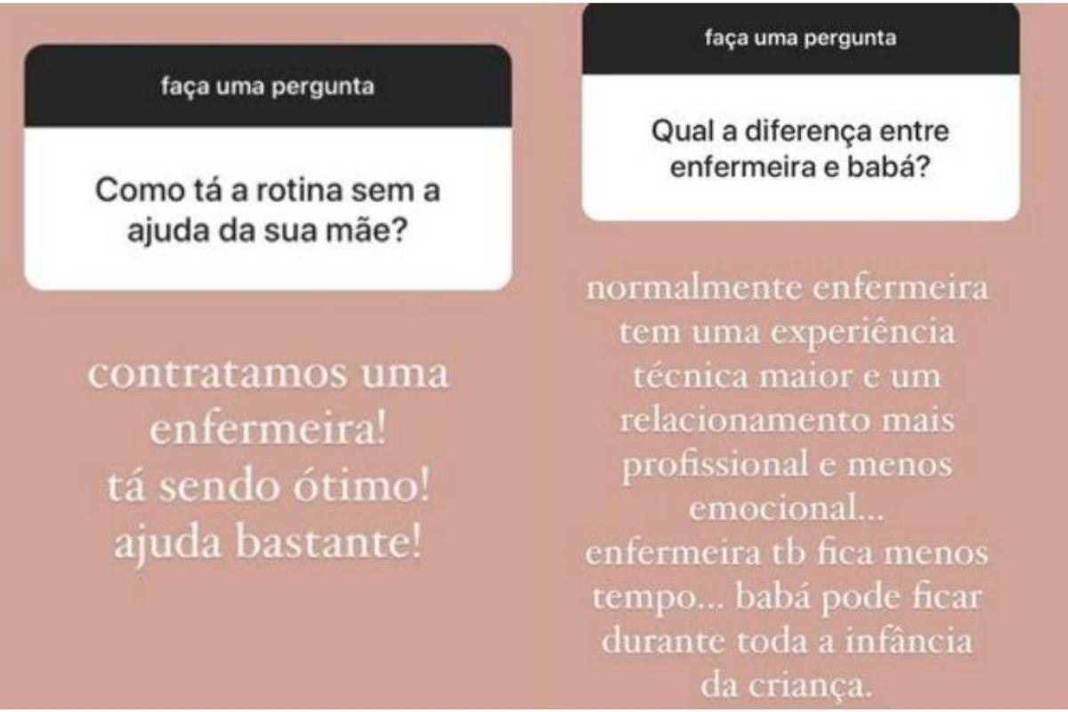 Ao responder às perguntas, a modelo contou que o casal contratou uma enfermeira para auxiliar nos cuidados com a bebê. Ao ser questionada sobre como está sendo cuidar da bebê sem a ajuda da mãe, Carol contou sobre a contratação “Contratamos uma enfermeira. Está sendo ótimo, ajuda bastante”, escreveu, nos Stories do Instagram.