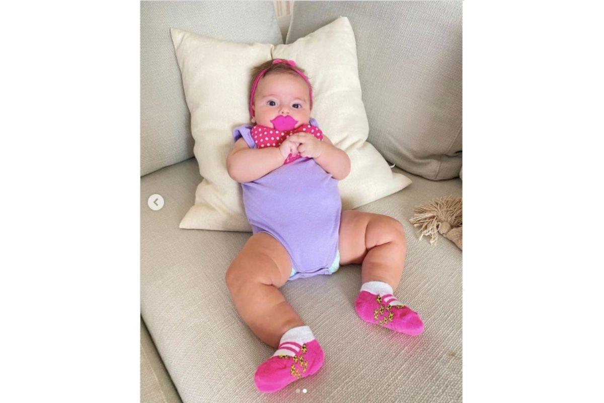 Nesta quinta-feira, 21 de janeiro, Carol Dias, compartilhou foto da filha Esther, fruto do relacionamento com o ex-jogador de futebol Kaká. Na imagem, a bebê de 3 meses aparece com uma chupeta divertida na boca, roupa lilás e laço rosa na cabeça.