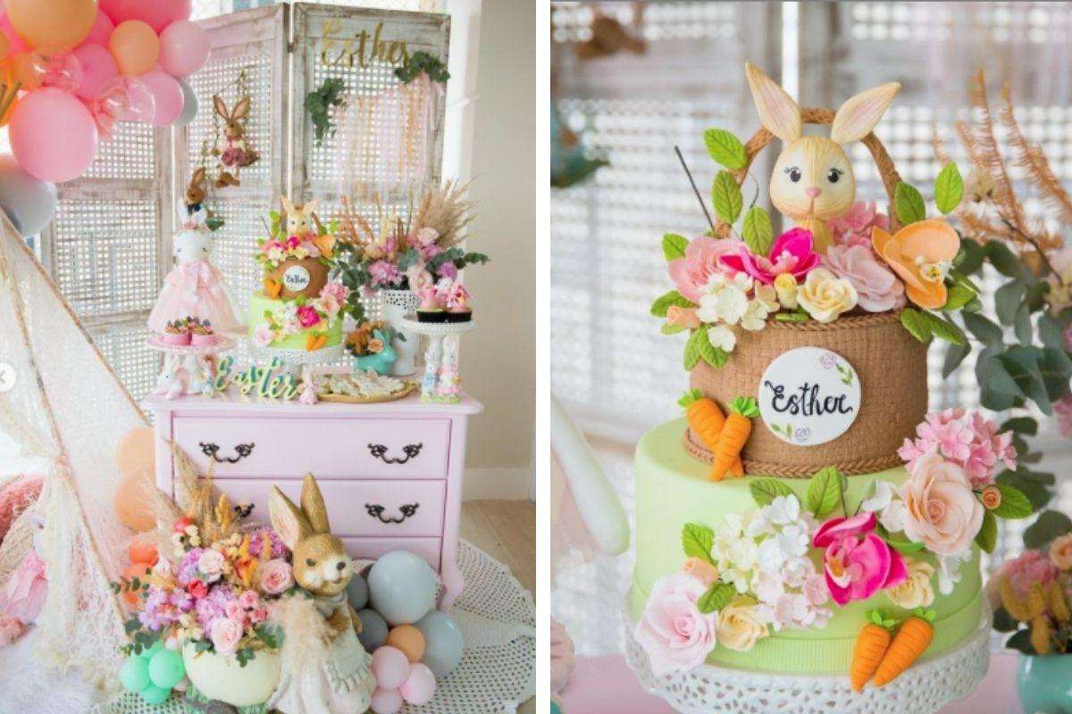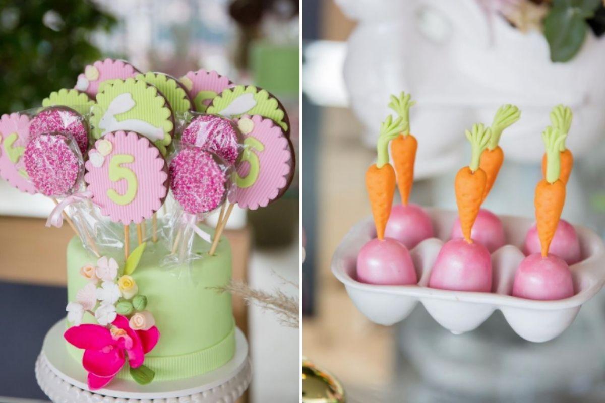 A festa contou com tons pastéis, flores e claro, muitos coelhos de decoração! Os doces tinham formato de cenoura e detalhes com o 5 estampado, representado os meses de vida de Esther. O topo do bolo foi em formato de cesta, mas ao invés de ovos, havia um coelho rodeado por flores.