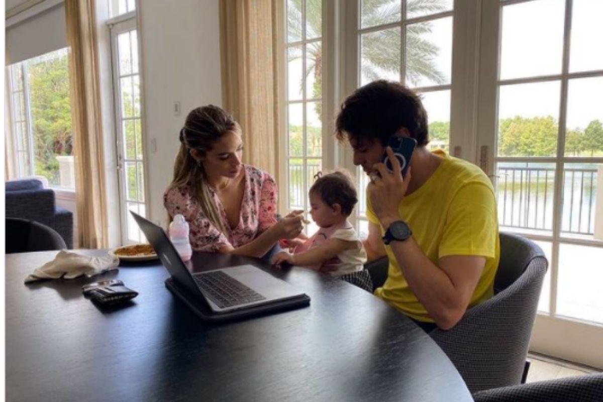 A modelo publicou um clique exibindo a rotina de sua casa, mostrando ela na função de mãe, cuidando da filha e Kaká trabalhando com a pequena no colo. Na legenda, ela aproveitou para se declarar para a família: “E assim vai, amo muito!”.