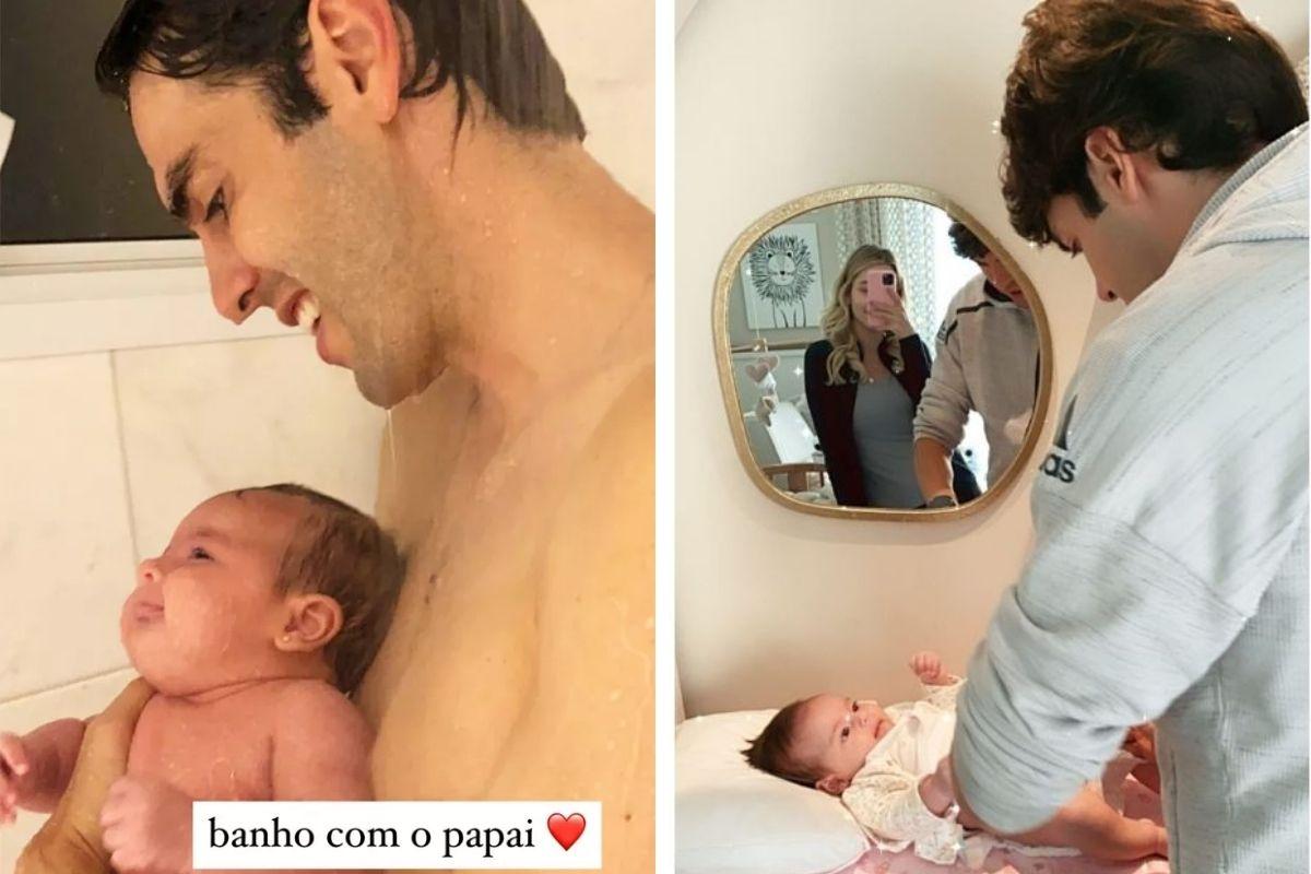 Na imagem, Kaká aparece sorridente com a primeira filha do casal no colo. “Banho com o papai”, babou Carol Dias na legenda da publicação. A mãe de primeira viagem, tem registrado muitos momentos da maternidade e mostrou que está recebendo o apoio do marido em todos os momentos.