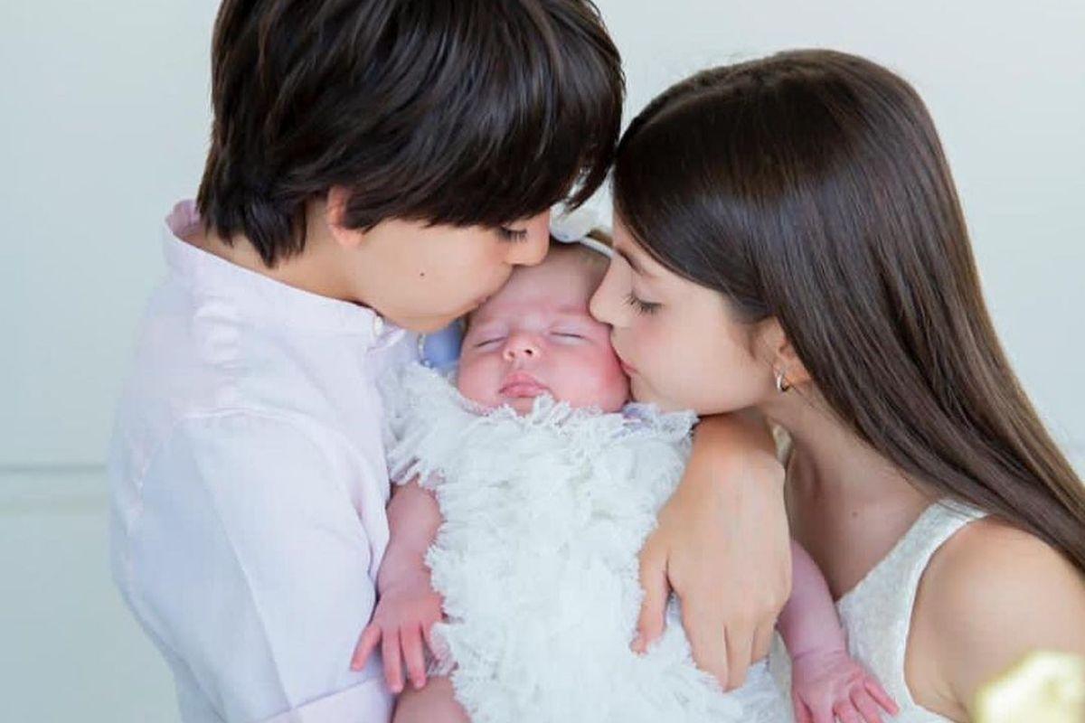 Todos estão vestidos de azul, os meninos com camisa social e as meninas de vestido. Na outra foto da sequência são apenas os filhos do ex-jogador que protagonizam a imagem. Com Luca e Isabella dando um beijo ‘sanduíche’ em Esther, que recentemente completou 1 mês.
