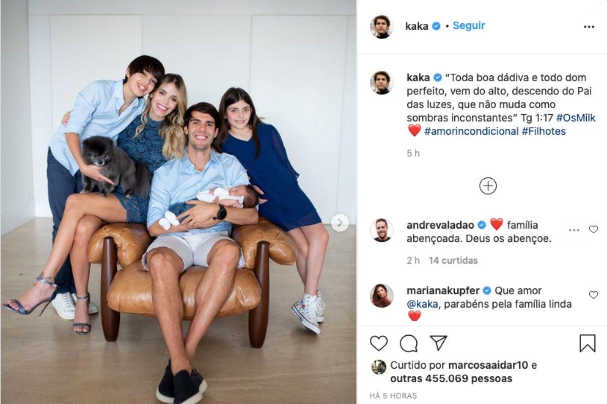 “‘Toda boa dádiva e todo dom perfeito, vem do alto, descendo do Pai das luzes, que não muda como sombras inconstantes’ Tg 1:17”, legendou Kaká. Nos comentários, os fãs não pouparam elogios. “Lindos”, comentou uma internauta. “Família linda”, disse outras. “Maravilhosos”, completou uma internauta.