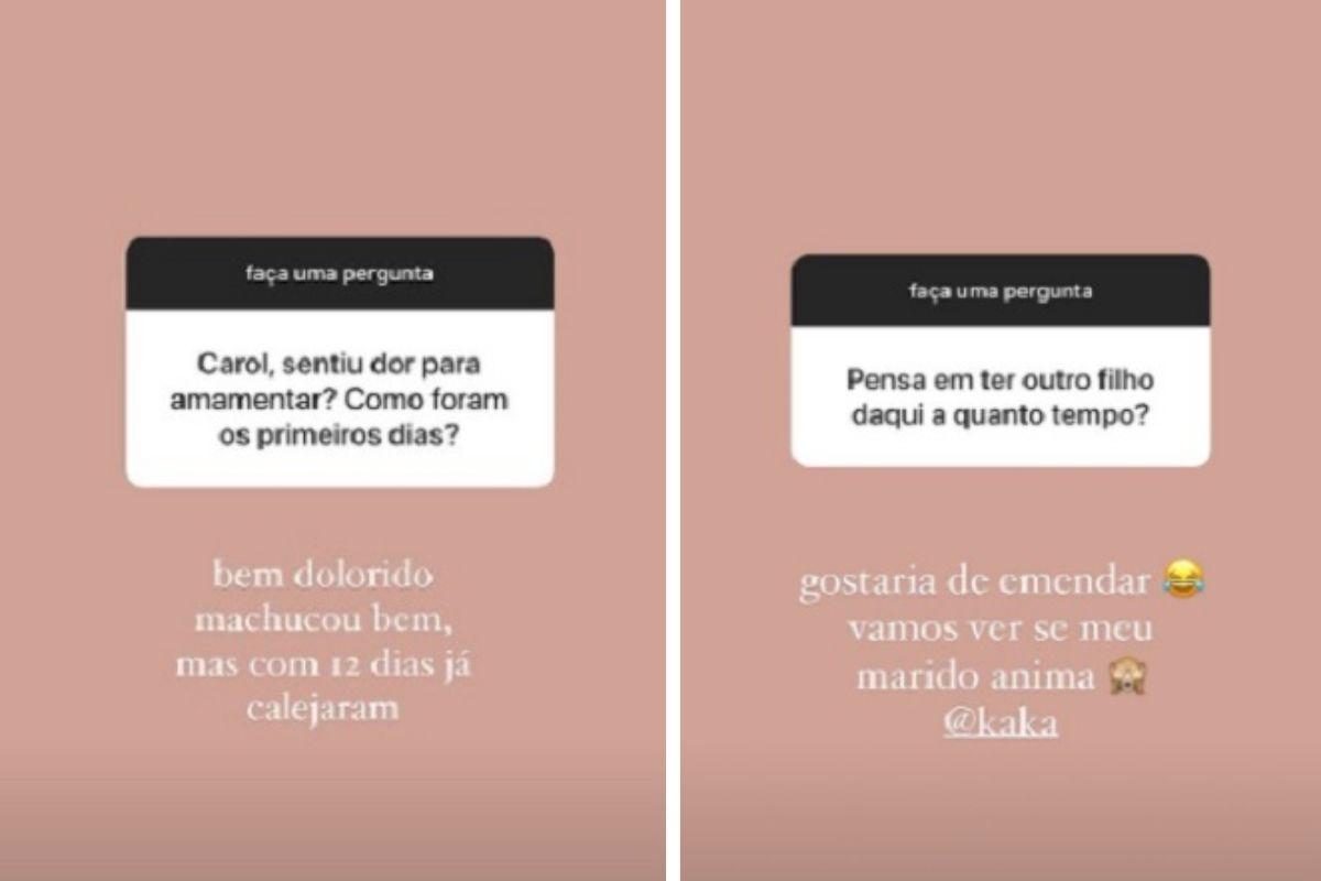Na caixa de perguntas do Instagram a modelo foi questionada: “Pensa em ter outro filho daqui a quanto tempo?”. Surpreendendo os seguidores na resposta, Carol disse que dependendo dela, Esther ganhará um irmão logo! ‘“Gostaria de emendar”, escreveu. “Vamos ver se meu marido anima”, completou. Além da bebê, Kaká já é pai de Isabella, de 8 anos, e Luca, de 12, frutos do relacionamento do ex-jogador de futebol com Carol Celico.
