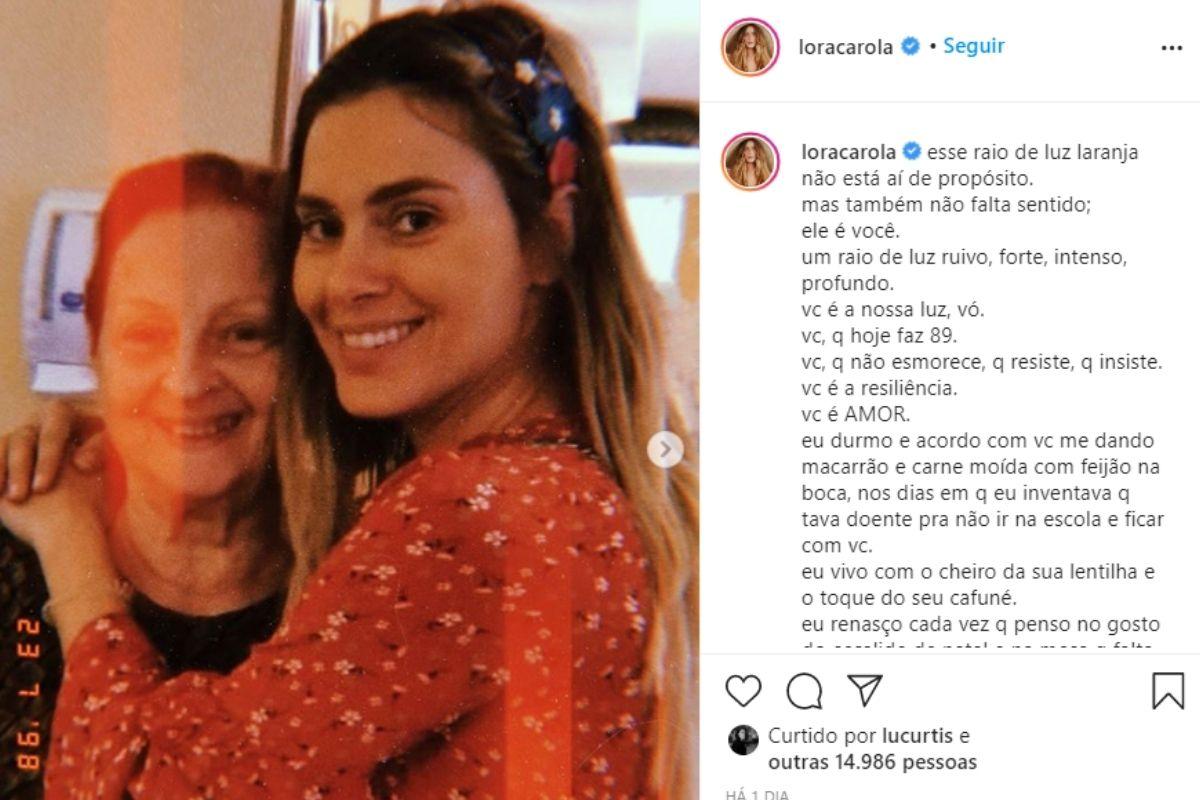No mesmo dia, Carolina publicou uma imagem dela com a avó e se declarou para a aniversariante. “Esse raio de luz laranja não está aí de propósito. Mas também não falta sentido; ele é você. Um raio de luz ruivo, forte, intenso, profundo. Você é a nossa luz, vó. Você, que hoje faz 89. Você que não esmorece, que resiste, que insiste. Você é a resiliência. Você é amor. Eu durmo e acordo com você me dando macarrão e carne moída com feijão na boca, nos dias em que eu inventava que tava doente pra não ir na escola e ficar com você. Eu vivo com o cheiro da sua lentilha e o toque do seu cafuné. Sou feita de você em detalhes. Eu te amo, vó. Muito. Mais do que é possível. Hoje pode ser difícil… Mas sei que você vai vencer. Feliz aniversário!”, disse a neta.
