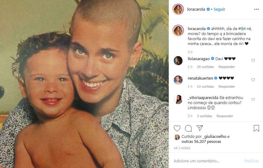 “Do tempo em que a brincadeira favorita do Davi era fazer carinho na minha careca… Ele morria de rir!”, relembrou a atriz na legenda da publicação. Na foto, ela está abraçada com o filho mais velho Davi Frota, fruto de seu relacionamento com o ator Marcos Frota.