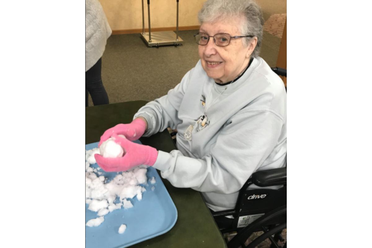 Imagina que luxo poder brincar na neve sem sair do conforto e do quentinho! E olha como essa senhora fez uma bagunça brincando com as luvas rosas! A ação deixou os idosos muito felizes, e foi essencial para entretê-los dentro da casa.