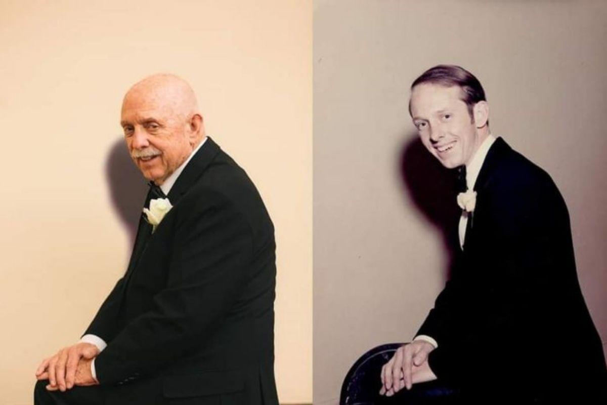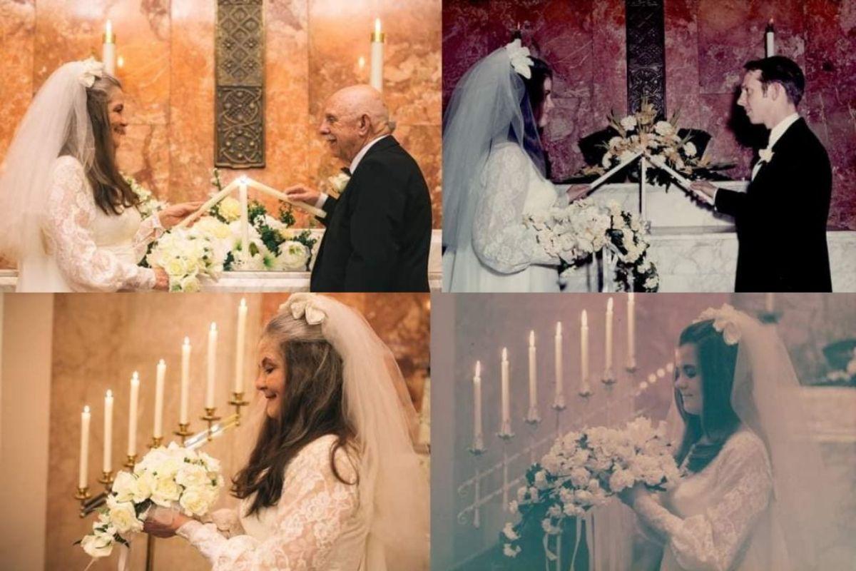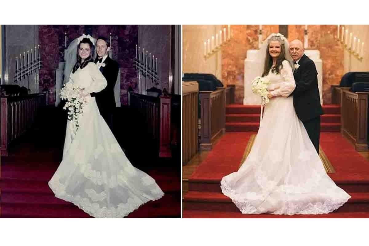 Para recriar o álbum de foto do casamento, ela usou o mesmo vestido de noiva que cinquenta anos atrás, arrumou o cabelo da mesma maneira, e repetiu os gestos junto do marido para ter fotos idênticas às anteriores, todas tiradas na mesma igreja em que se casaram.