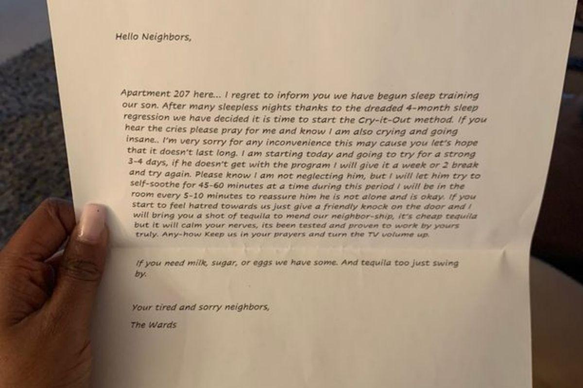 O casal exausto deixou um bilhete na porta de cada um dos vizinhos explicando que eles haviam começado a treinar o bebê para dormir a noite toda e estavam tentando o método de deixar a criança chorar até dormir.  Na carta, a mãe “cansada e arrependida” desculpava-se antecipadamente pelo choro que todos provavelmente ouviriam, até mesmo convidando-os a tomar leite, açúcar, ovo ou tequila se precisassem.