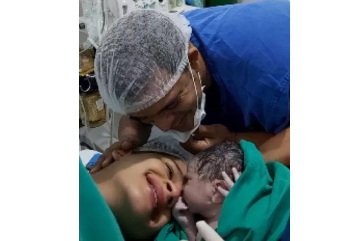 Os momentos emocionantes para os pais de primeira viagem foram registrados, e o bebê veio ao mundo saudável, pesando quase 4 quilos e medindo 50 centímetros.