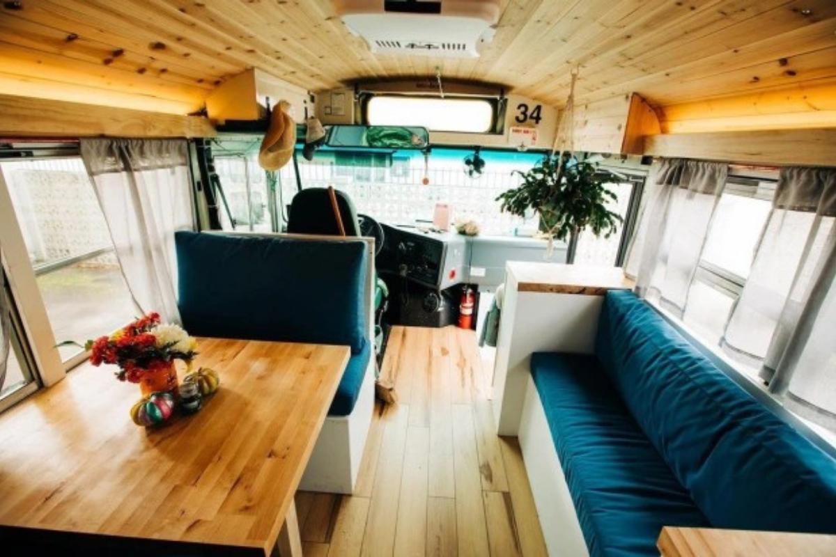 Elizabeth e Spike construíram uma plataforma de madeira dentro do ônibus para caber em uma cama queen-size. Eles também instalaram um beliche para os dois filhos no lado oposto do ônibus. O casal acrescentou um banheiro e um chuveiro na roda traseira do ônibus e construiu uma cozinha interna para cozinhar as refeições em um fogão elétrico e uma panela instantânea.