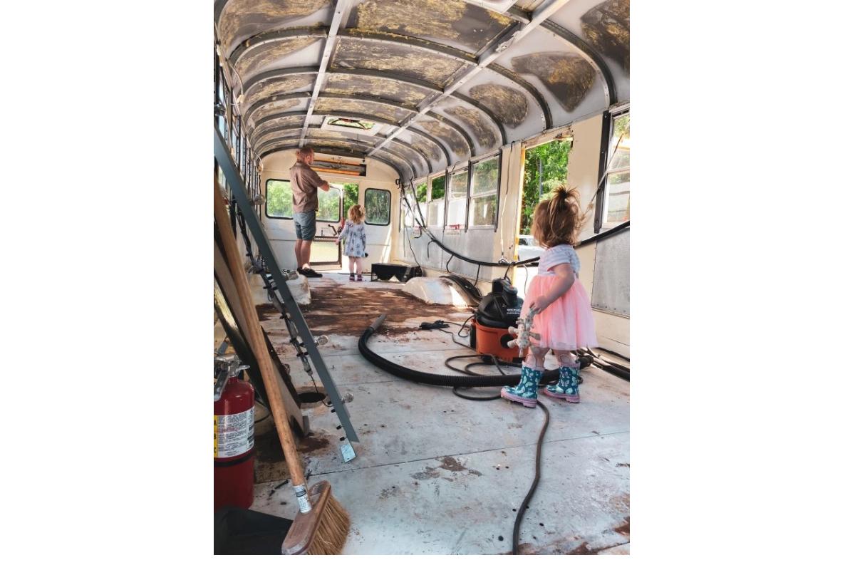 Em junho de 2020, Elizabeth e Spike compraram um ônibus antigo no Facebook Marketplace por $ 3.500 (RS 18.760). Primeiro, eles arrancaram tudo, incluindo o piso de metal e as costelas do veículo. Em seguida, a dupla pintou a parte externa do ônibus com um verde vibrante e teto branco.