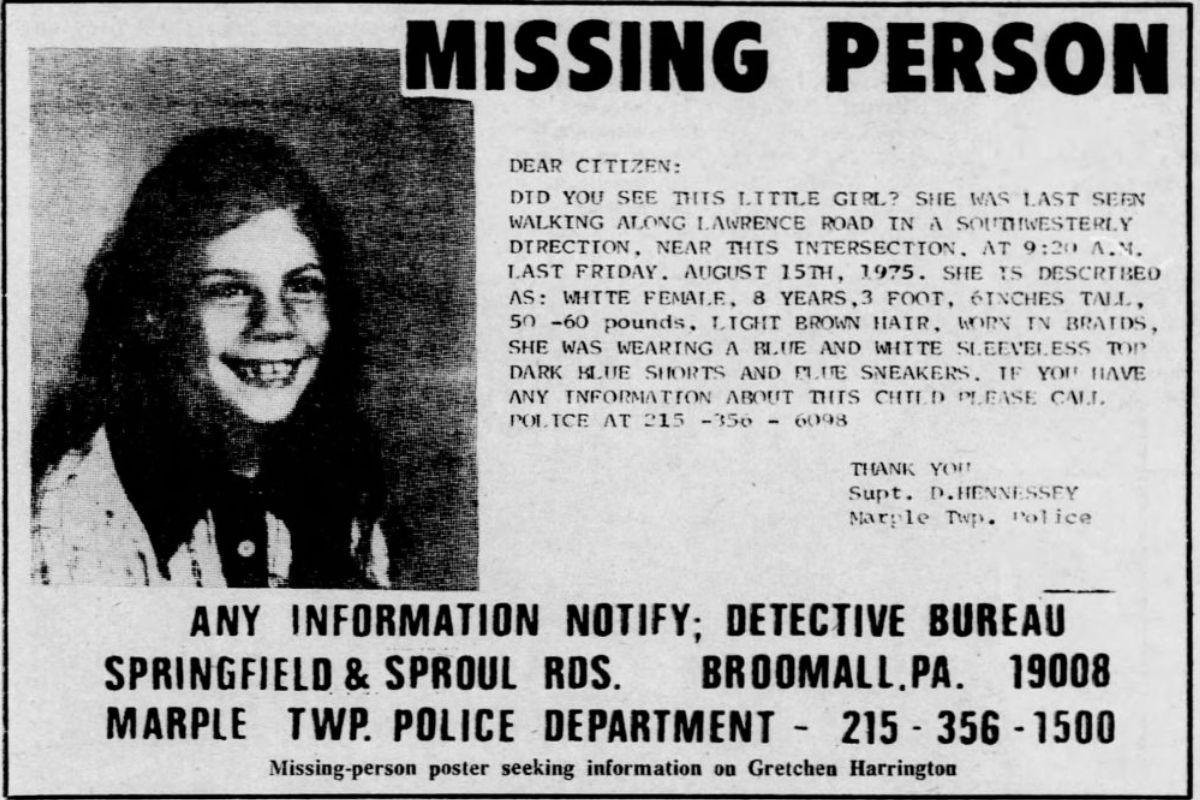 Um ex-pastor de uma igreja nos Estados Unidos, que presidiu funerais por mais de 50 anos, foi recentemente acusado do assassinato de Gretchen Harrington, uma menina que foi sequestrada há 48 anos. Gretchen tinha apenas 8 anos quando desapareceu em 15 de agosto daquele ano, durante um acampamento religioso de verão, no subúrbio de Marple Township, na Filadélfia.
