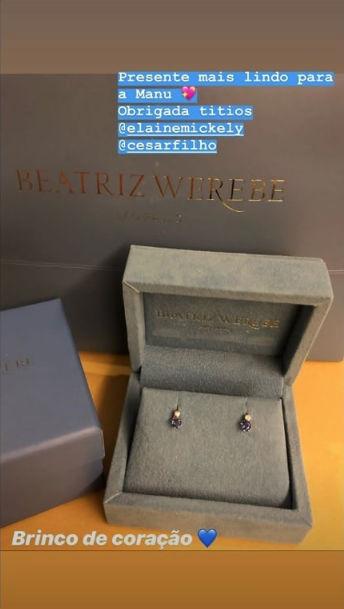 O presente foi de Cesar Filho e da esposa, a atriz Elaine Mickely, e Ticiane Pinheiro fez questão de mostrar tudo nos Stories no Instagram, onde tem mais de 6 milhões de seguidores. “Presente mais lindo para a Manu! Obrigada titios. Brinco de coração”, escreveu Tici.
