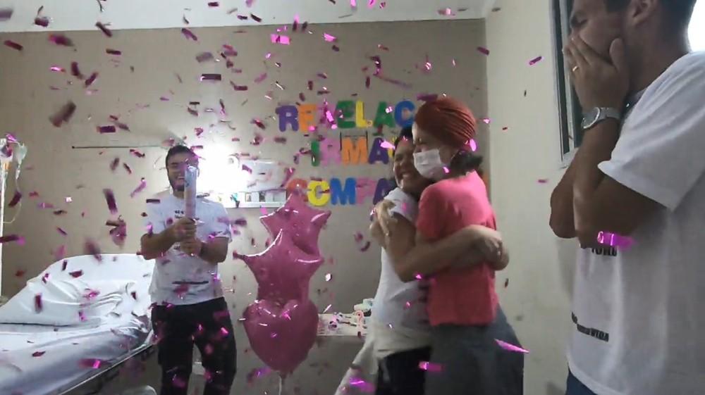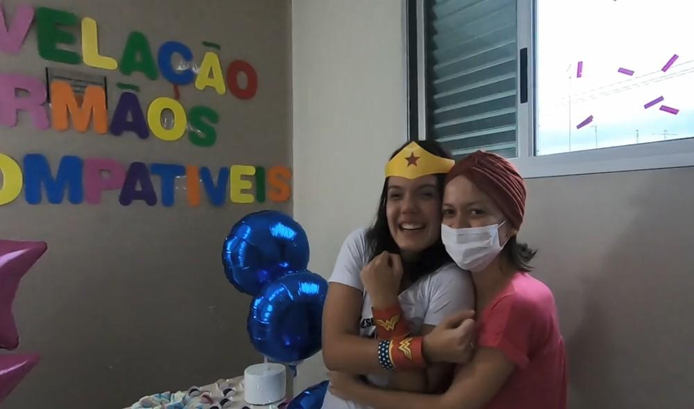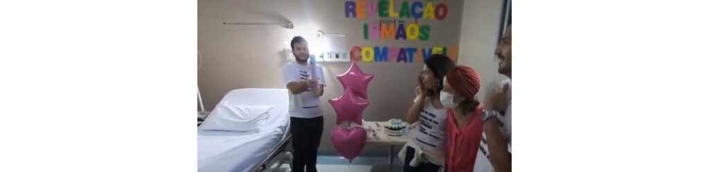 Pâmela já sabia o resultado e resolveu contar a notícia aos irmãos de uma maneira diferente: com um chá revelação ‘surpresa’, já que são um homem e uma mulher. Ela chamou os irmãos para irem ao hospital, preparou tudo e anunciou o resultado: Ana, irmã mais nova, será a doadora.