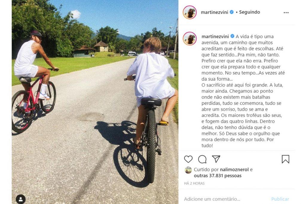 Hoje não foi diferente. Para homenagear o jogador, Vini compartilhou uma foto sua andando de bicicleta ao lado de Davi Lucca. Na legenda, começou: “A vida é tipo uma avenida, um caminho que muitos acreditam que é feito de escolhas. Até que faz sentido… Pra mim, não tanto. Prefiro crer que ela não erra. Prefiro crer que ela prepara todo e qualquer momento. No seu tempo… Às vezes até da sua forma…”.