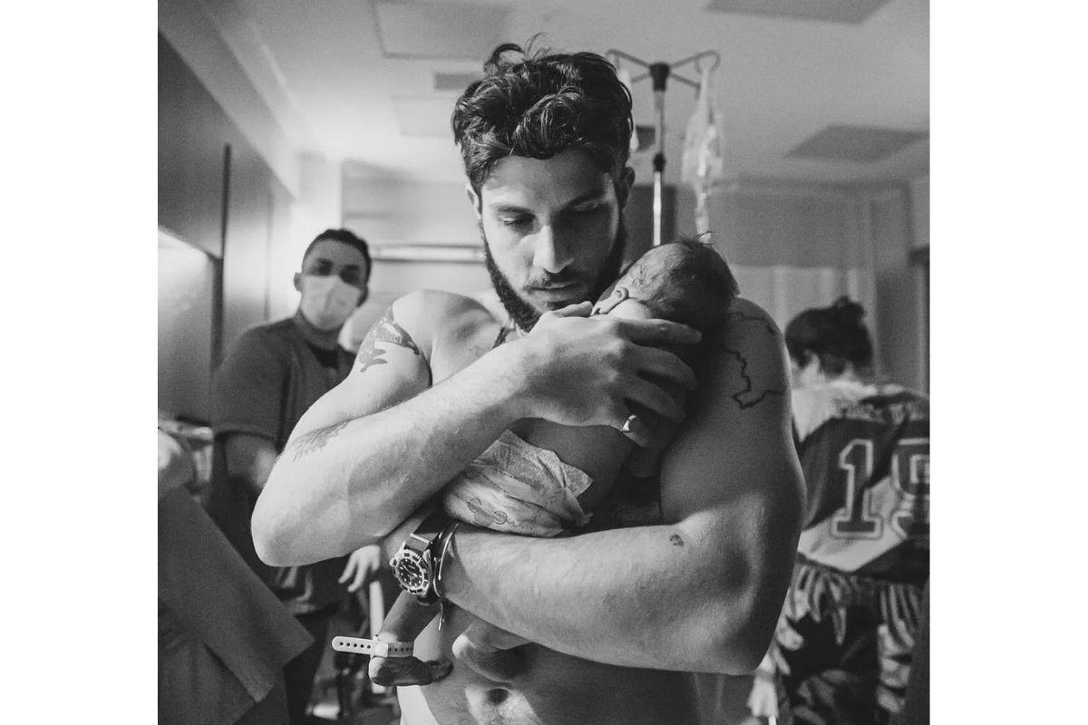 Na foto em preto e branco, Chay aparece segurando José no colo sem camisa. Na legenda da publicação, o ator ainda ressaltou, “Que momento!”.
