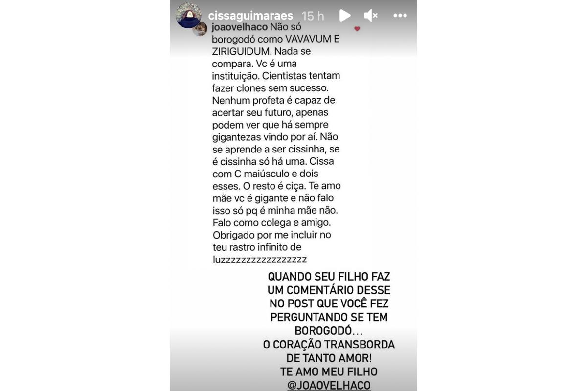 Ao ver a mensagem do filho, Cissa agradeceu. “Quando seu filho faz um comentário desse no post em que você fez perguntando se tem borogodó, o coração transborda de tanto amor. Te amo, meu filho”, afirmou.