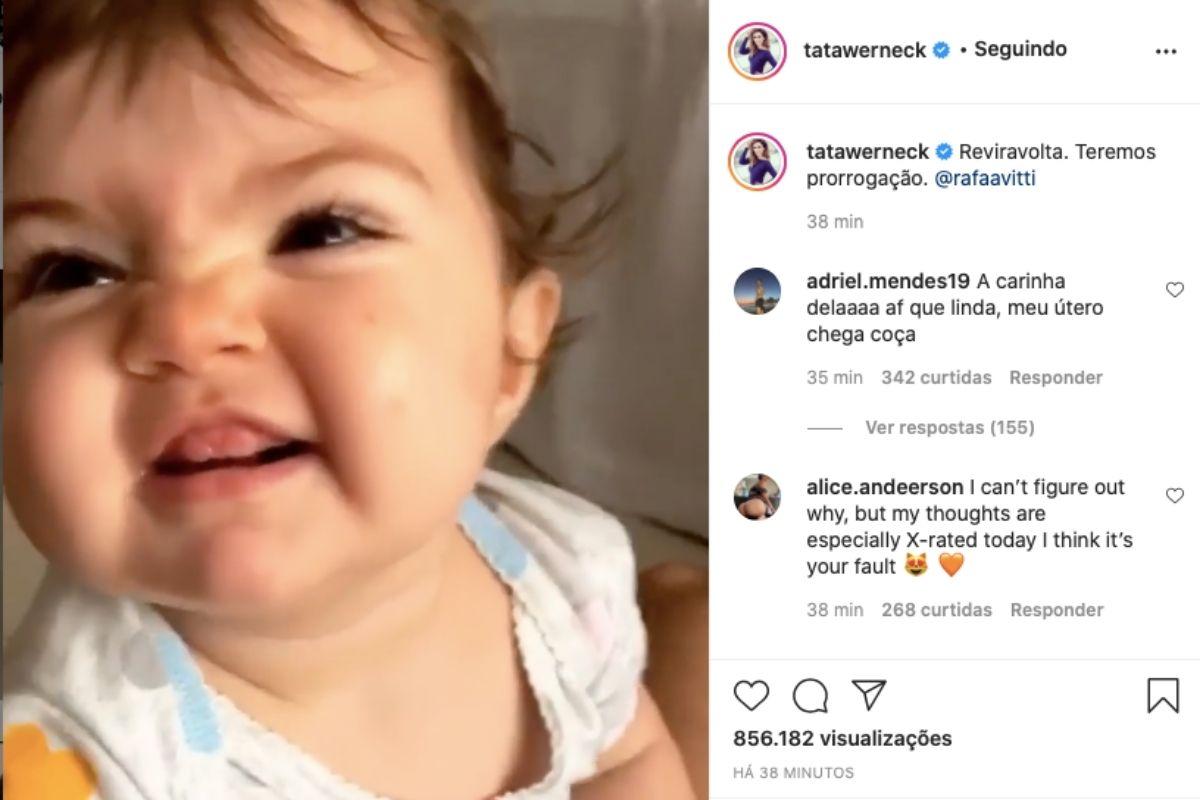 A comediante Tatá Werneck usou as redes sociais no último domingo, 20 de setembro, para compartilhar um vídeo da filha, Clara Maria, fruto do relacionamento com o ator Rafa Vitti. Nas imagens, a bebê aparece ao lado do pai. Rafa, então, pergunta para ela “quem sou eu?”. Sem pensar duas vezes, Clara responde “mamãe”. Rindo com a resposta, ele diz “Eu sou o papai”. Vendo o riso do pai, a bebê começa, então, a sorrir também.