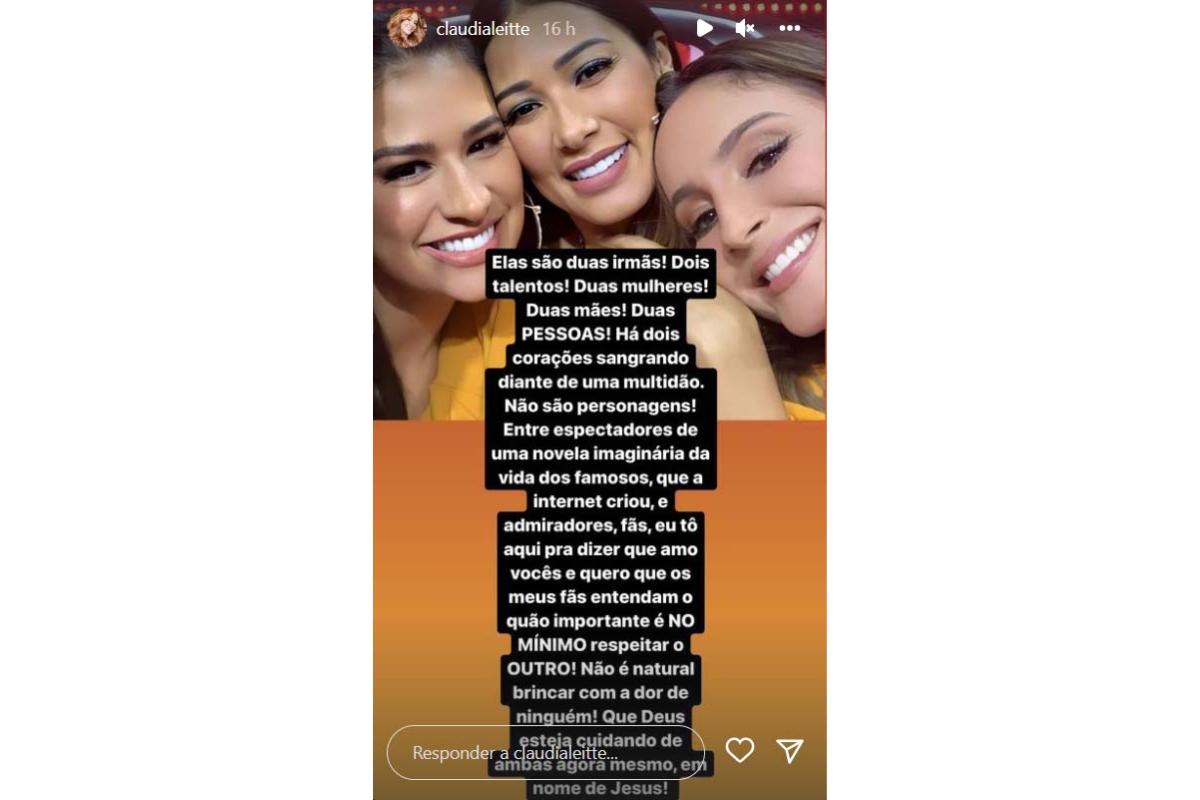 Ela ainda continuou: “Entre espectadores de uma novela imaginária da vida dos famosos, que a internet criou, e admiradores, fãs. Eu estou aqui para dizer que amo vocês e quero que os meus fãs entendam o quão importante é no mínimo respeitar o outro! Não é natural brincar com a dor de ninguém! Que Deus esteja cuidando de ambas agora mesmo, em nome de Jesus”, concluiu.