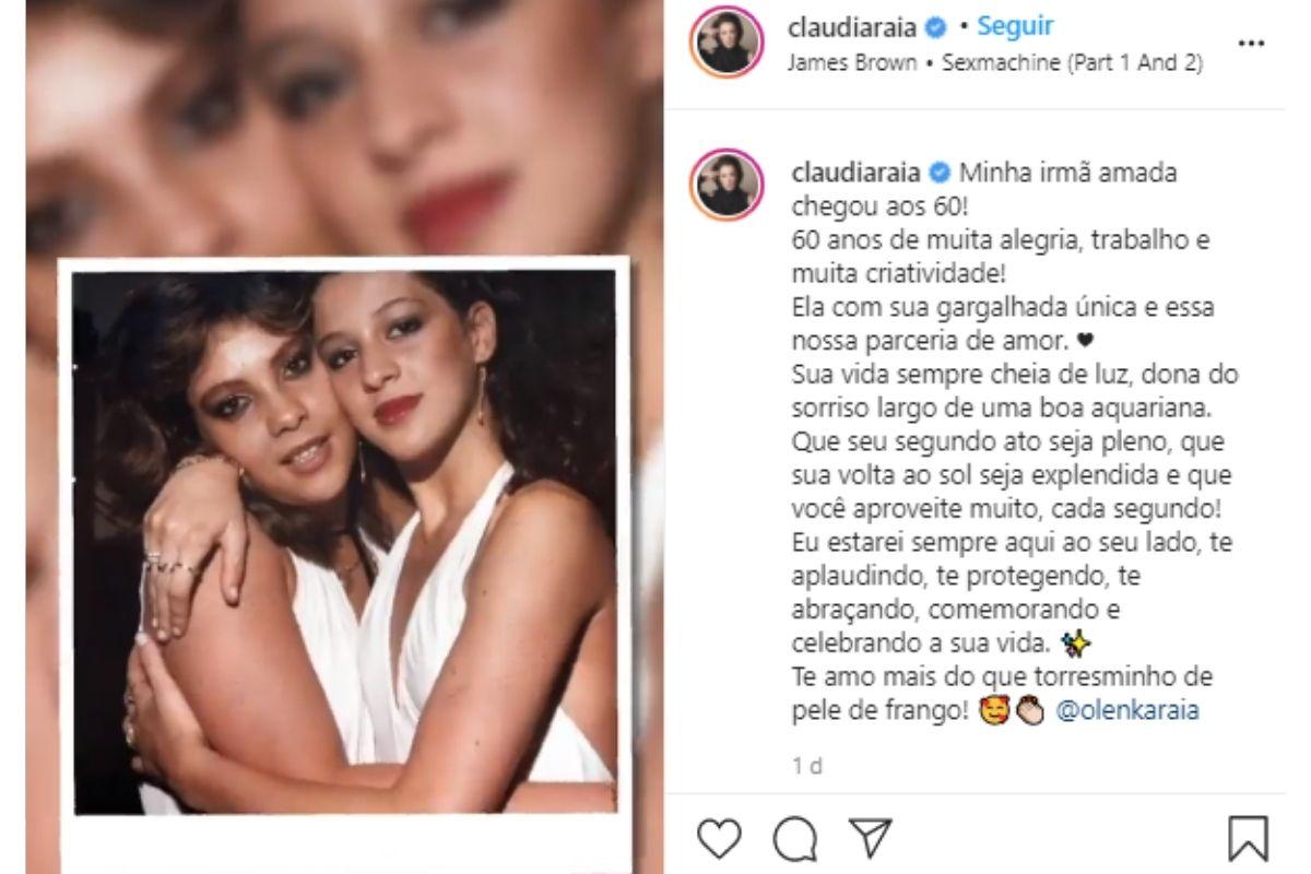 Na legenda da publicação, Claudia se declarou para Olenka. “Minha irmã amada chegou aos 60! 60 anos de muita alegria, trabalho e muita criatividade! Ela com sua gargalhada única e essa nossa parceria de amor. Sua vida sempre cheia de luz, dona do sorriso largo de uma boa aquariana. Que seu segundo ato seja pleno, que sua volta ao sol seja esplendida e que você aproveite muito, cada segundo!”, começou escrevendo.