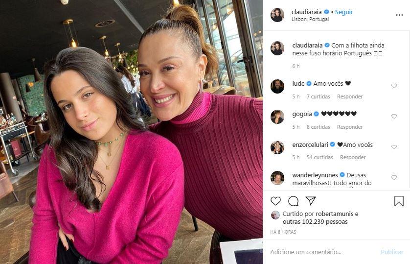 “Com a filhota ainda nesse fuso horário português”, escreveu Claudia na legenda da publicação. Além de Sophia, de 17 anos, Claudia Raia também é mãe de Enzo. Ambos são frutos de seu relacionamento com o ator Edson Celulari.