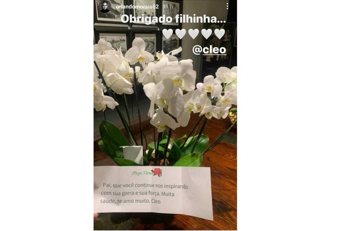 Nesta quinta-feira (1), ele também mostrou algumas mensagens de apoio que recebeu após ter alta. Entre elas, o músico ganhou um presente especial de Cleo, filha de sua mulher, Glória Pires, com Fábio Jr., mas que o considera um segundo pai. Nos stories, Orlando mostrou a homenagem que recebeu de Cleo: um vaso de orquídeas brancas, com um bilhete carinhoso. “Pai, que você continue nos inspirando com sua garra e força. Muita saúde, te amo muito”, escreveu Cleo. “Obrigado, filhinha”, respondeu o músico.