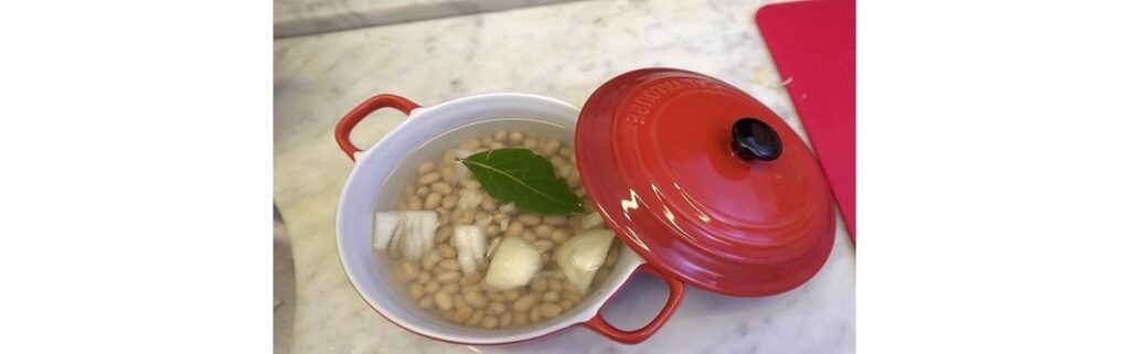 3. Coloque no feijão a cebola, a folha de louro, os dentes de alho e um fio de azeite.
