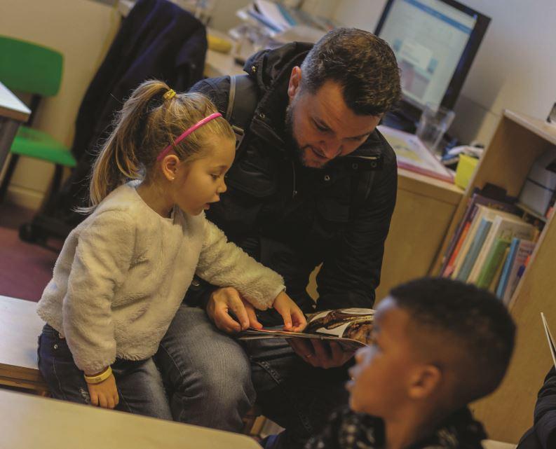 Enquanto a aula não começa, o pai aproveita para ler um livro com Nick. Dali ele vai para o trabalho e eu para um café ou para o escritório em casa.