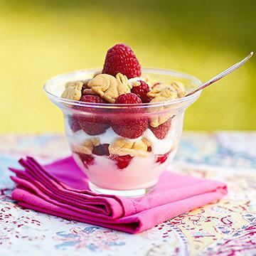 Iogurte com bolachas salgadas e framboesa dão um toque especial para o café da manhã.