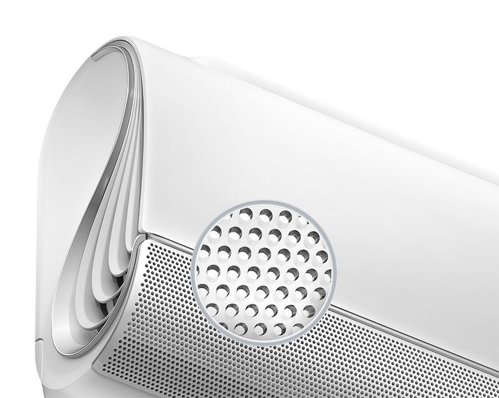 Com tecnologia e design pensados para uma distribuição do ar por todo o ambiente em 360º, o aparelho possui saídas laterais S-Wings e é o primeiro ar-condicionado do mundo a ter aletas duplas, compostas com mais de 7.900 minifuros de tamanhos e direções diferentes. É essa combinação que permite a distribuição do ar pelo ambiente sem fluxo direto e de uma forma muito mais suave.