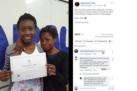 Eloá de Oliveira Rosa foi uma das homenageadas pela escola e convidada a receber o certificado de melhor aluna. Segundo a BBC Brasil, a criança está no sétimo ano, sexta-série, do ensino fundamental e não esperava pelo prêmio foi tudo uma surpresa! “Eu não esperava, porque no primeiro bimestre tive um desempenho mais ou menos na escola. Mas depois me dediquei mais aos estudos e melhorei”, disse em entrevista à BBC News Brasil.