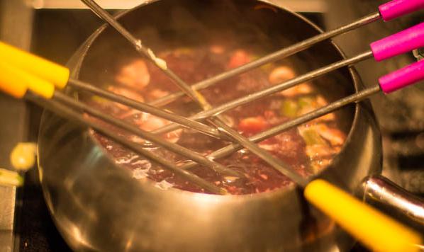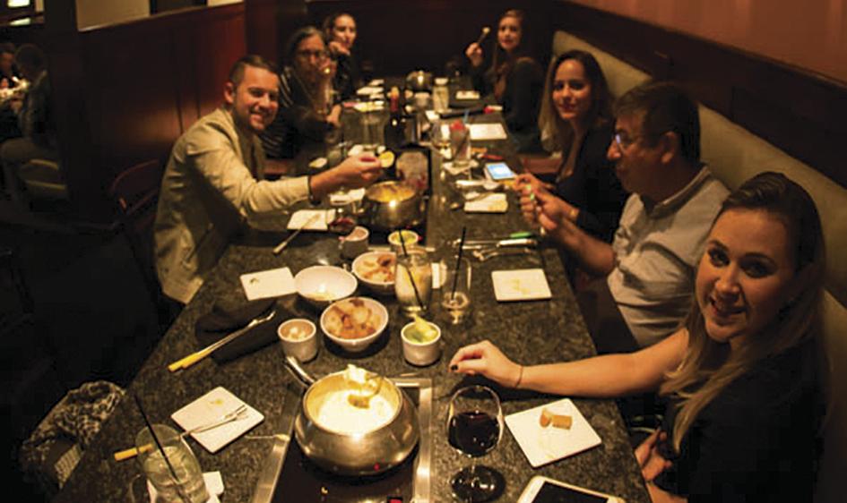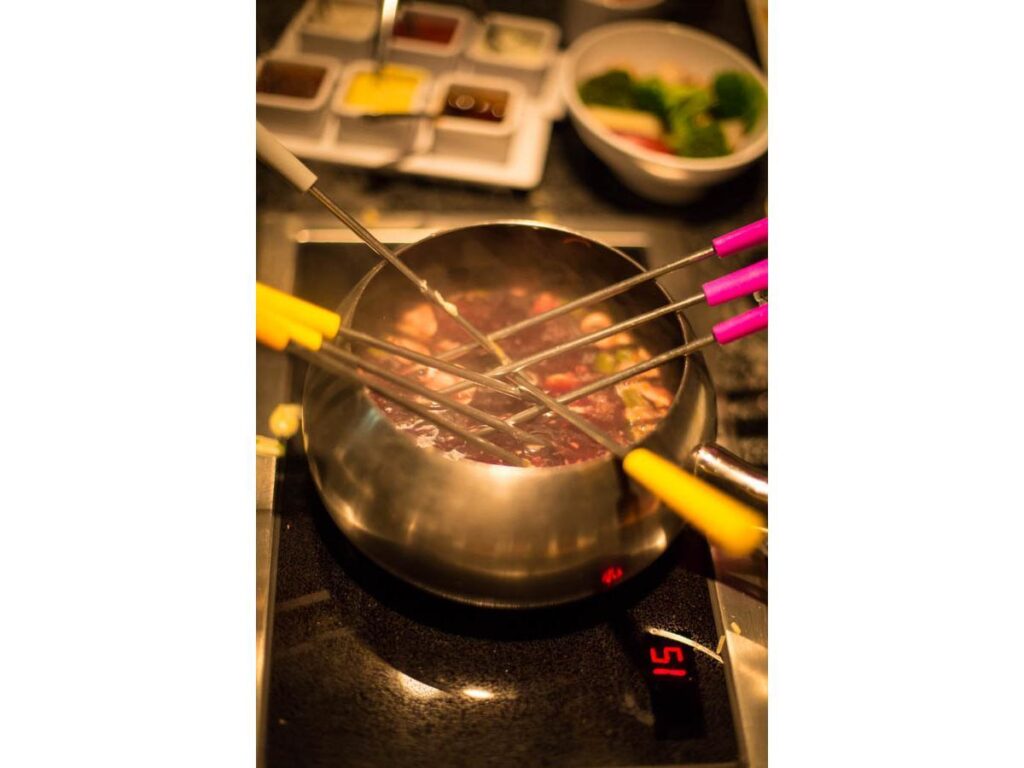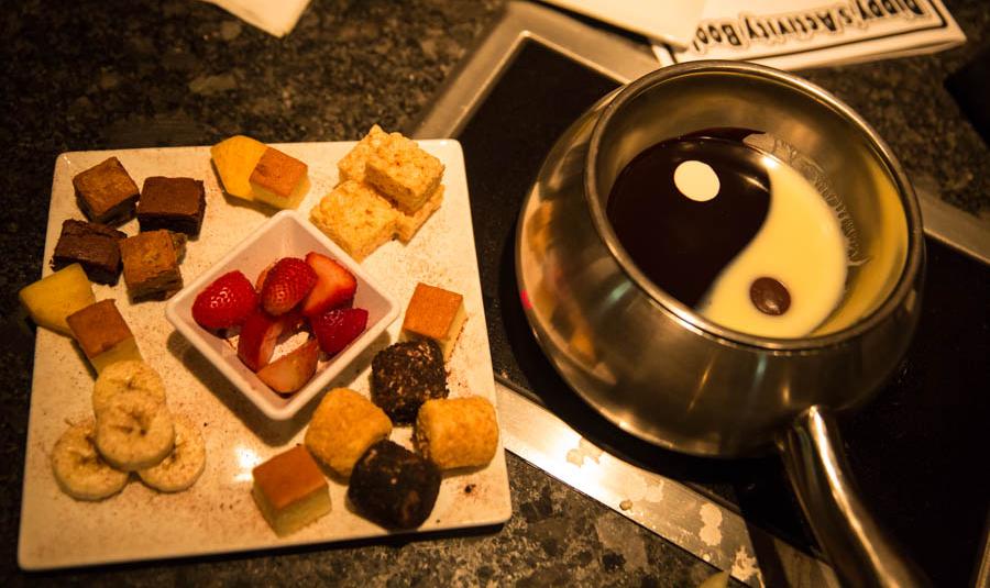 Primeiro, eles servem um creme de queijo delicioso com várias opções de pães caseiros e vegetais da época para experimentar, depois vem uma salada deliciosa. Aí, então, se prepare para os pratos quentes: carnes, massas e outras delícias para aproveitar a vontade. A melhor parte da noite, para quem é chocólatra: muito chocolate derretido, ao leite ou branco, para comer com frutas!
