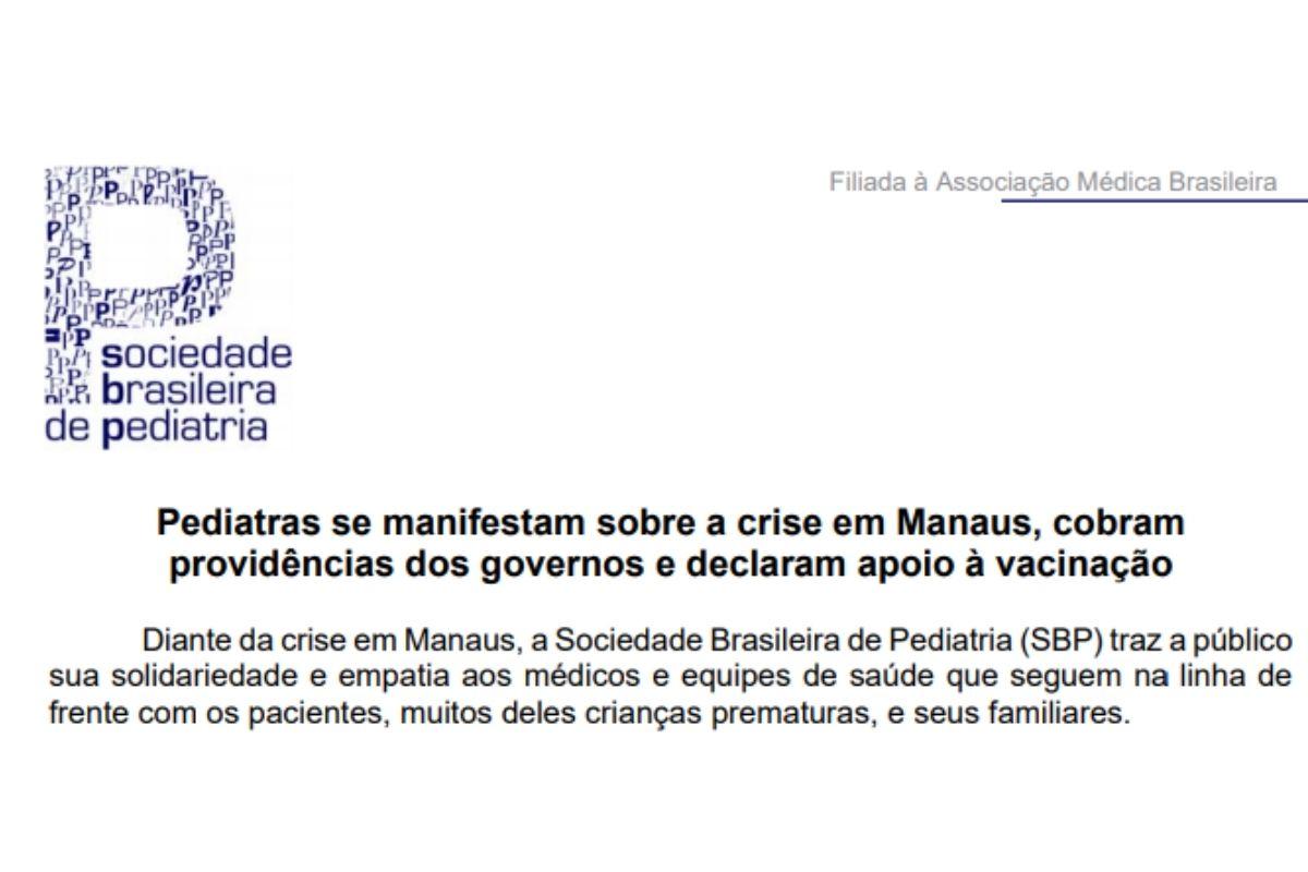A SBP acompanha com preocupação o avanço da pandemia e alerta para a tomada de providências que evitem que o cenário instalado no Amazonas se repita em outros estados”, diz a nota.