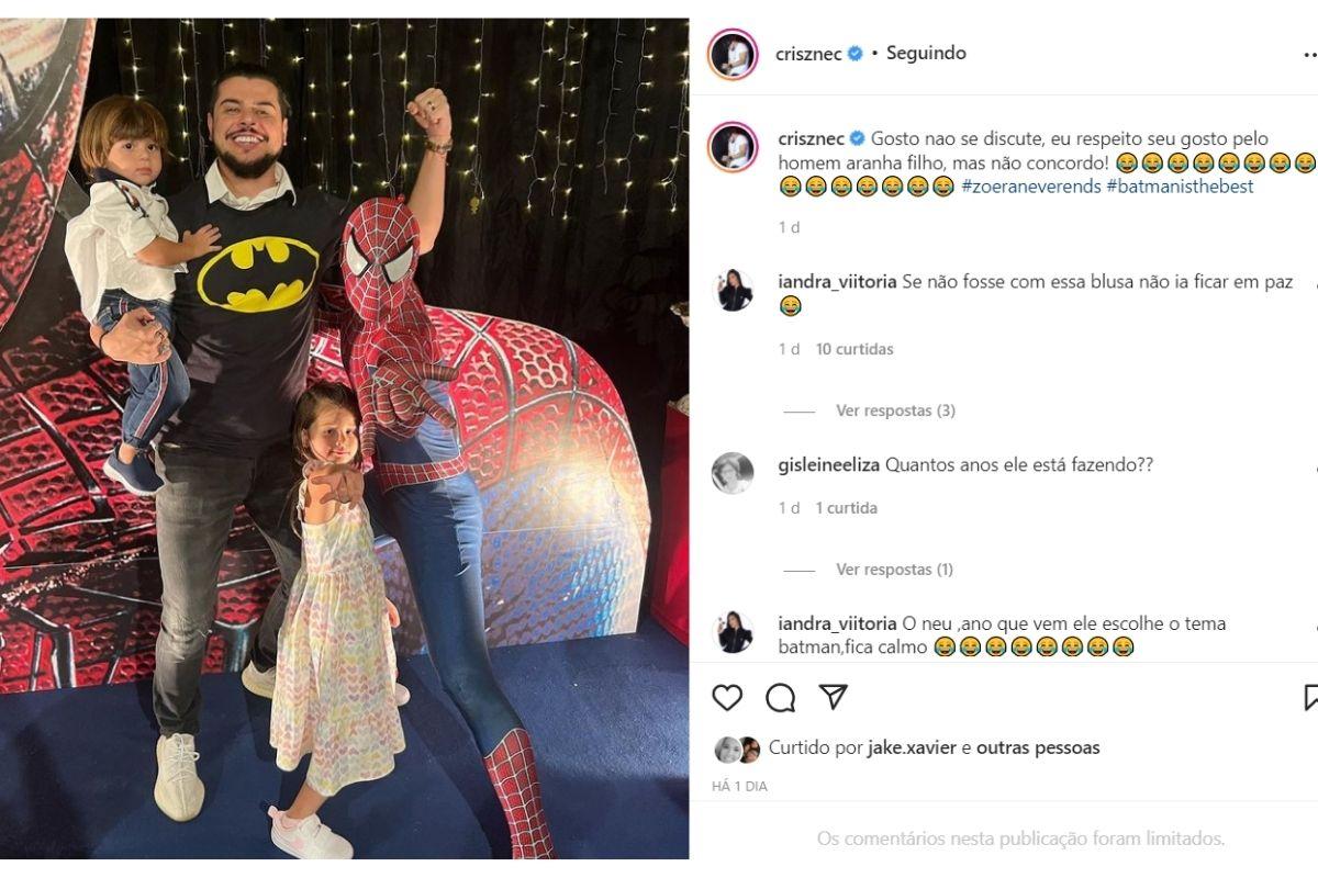 Cristiano aproveitou o momento em família para fazer postagem nas redes sociais e brincou na legenda. “Gosto não se discute, eu respeito seu gosto pelo Homem-Aranha filho, mas não concordo (rsrs)”. O pai de Pietra disse que prefere o Batman, e na foto postada com os filhos, ele está com uma camiseta do super-herói. A brincadeira levou os fãs a loucura e nos comentários da foto, um seguidor comentou “kkkk você é demais Cristiano, não dá”.