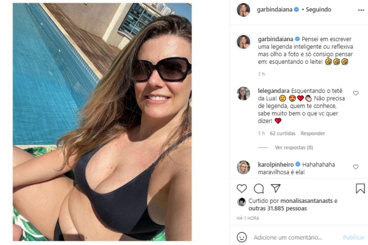 Mãe de primeira viagem, ela compartilhou uma foto sincera de biquíni mostrando a barriga pós-parto. Em uma foto de biquíni tomando sol, Daiana Garbin que está amamentando exclusivamente, fez uma brincadeira sobre o momento. “Pensei em escrever uma legenda inteligente ou reflexiva mas olho a foto e só consigo pensar em: esquentando o leite!”, escreveu ela na legenda.