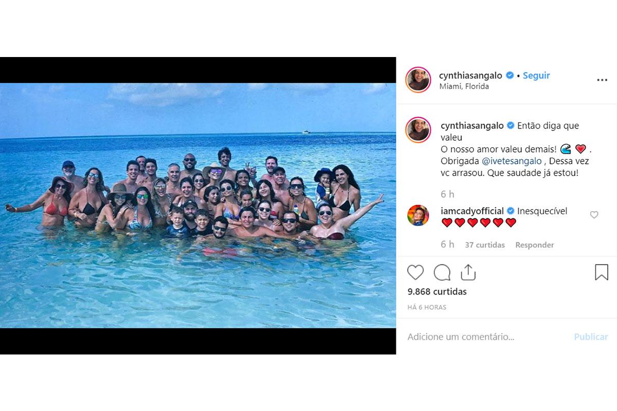 A irmã de Ivete compartilhou uma foto de todo mundo, 33 pessoas, dentro do mar. O cruzeiro, segundo as postagens de Cynthia, teve paradas no México e em Miami. A imagem foi publicada no sábado, 29 de junho, como um agradecimento à cantora.