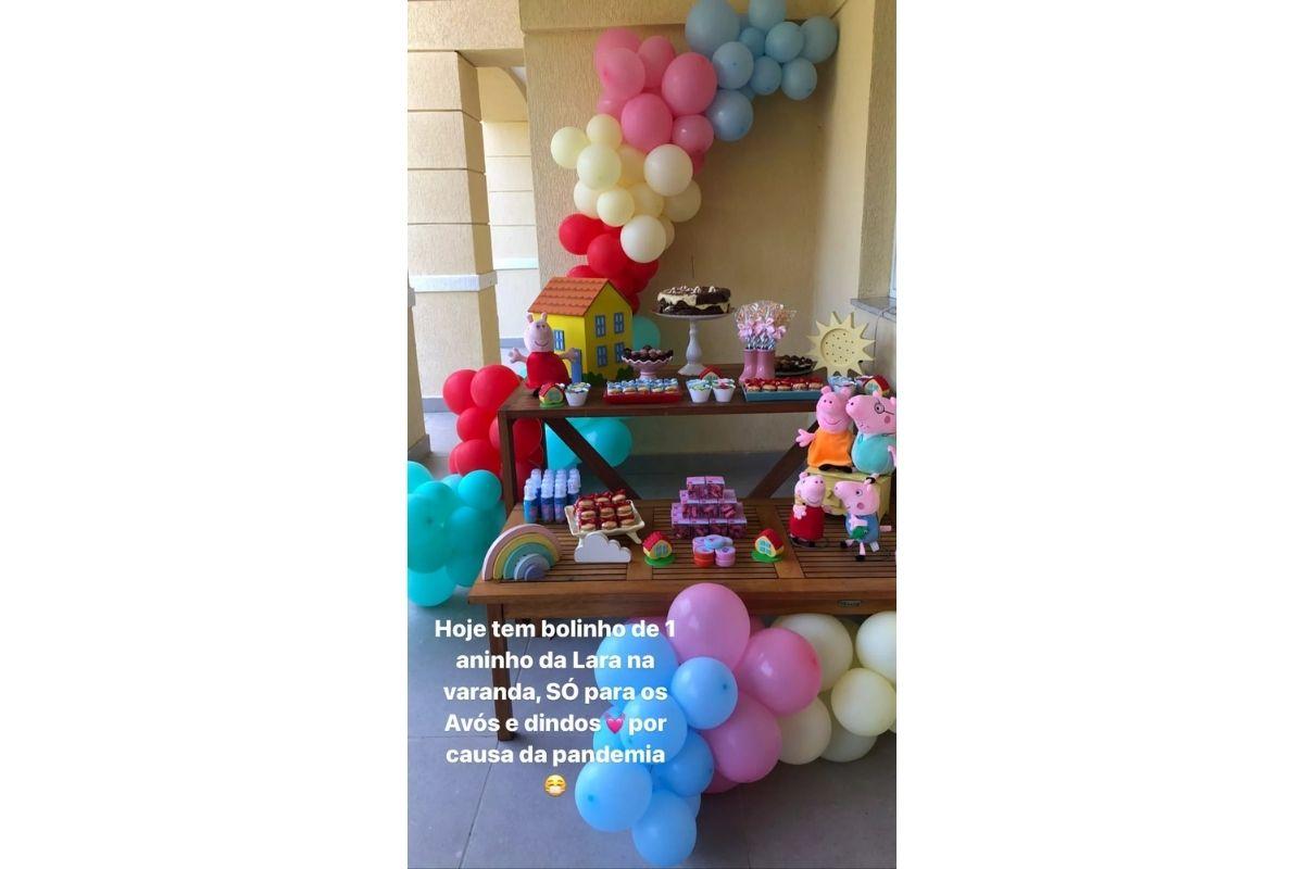 A festa, que teve como tema Peppa Pig, foi realizada apenas para parentes próximos. “Hoje tem bolinho de 1 aninho da Lara na varanda, só para os avós e dindos por causa da pandemia”, escreveu Dany Bananinha. Para decorar, ela apostou em bexigas coloridas nas cores dos personagens, além de doces personalizados.