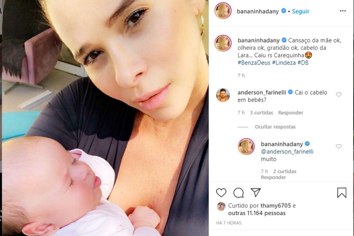 Na última quarta-feira, 3 de junho, a assistente de palco e atriz, Dany Bananinha, contou em suas redes sociais que o cabelo de sua filha recém-nascida, estaria caindo. Lara, que tem apenas dois meses de vida, nasceu com bastante cabelo mas agora está ficando careca.