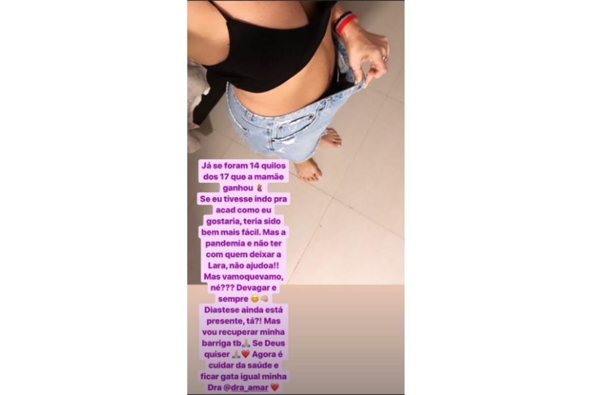 Nos stories, ela confessou já ter perdido quase todo o peso que ganhou ao longo da gravidez: “Já se foram 14 quilos dos 17 que a mamãe ganhou. Se eu tivesse indo para a academia, como eu gostaria, teria sido bem mais fácil. Mas a pandemia e não ter com quem deixar a Lara não ajudam. Vamos que vamos, né? Devagar e sempre! Diástase ainda está presente. Mas vou recuperar minha barriga também. Agora é cuidar da saúde”.