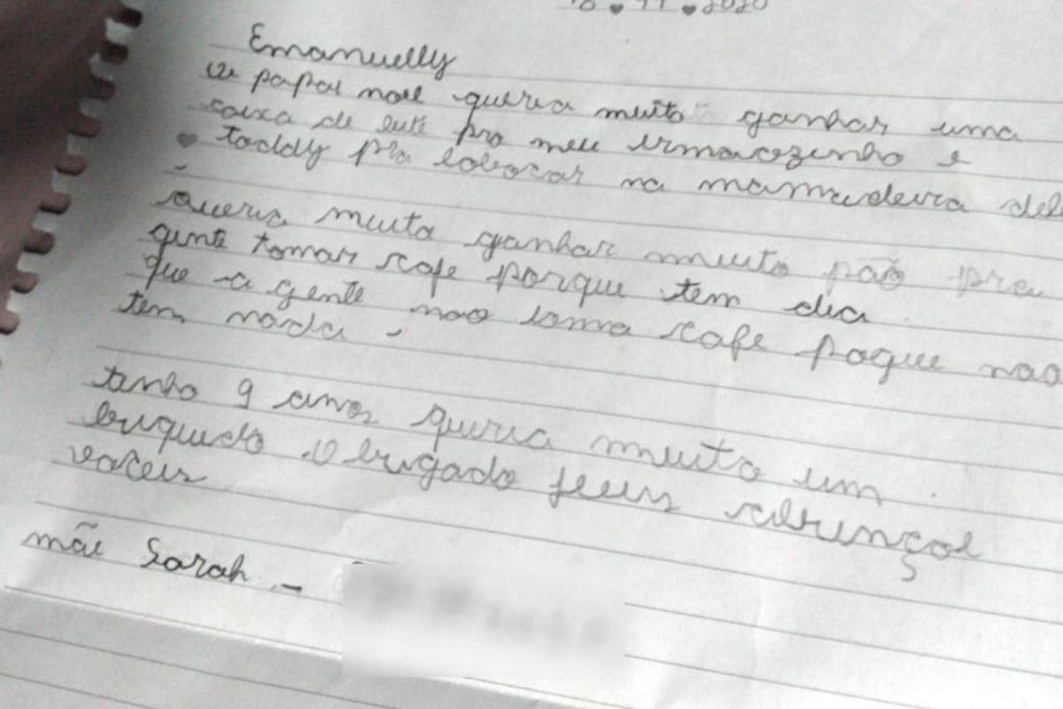 Ela também contou, ainda em entrevista ao G1, que a filha decidiu escrever a carta depois de ver um anúncio de televisão. “Ela viu na TV que os Correios estão entregando as cartas para o Papai Noel e perguntou se poderia escrever. Me deu um aperto no coração. Aqui a gente quase não toma café, só quando tem doação”, ela contou. A família vive de doações de alimentos que recebe, além de estar com as contas de energia e água atrasadas.