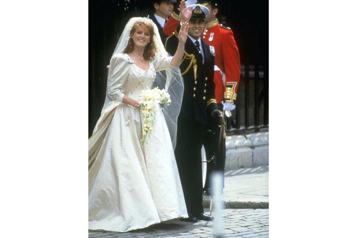 A esposa do príncipe Andrew usou um vestido avaliado em £ 35.000 (R$267 mil), com detalhes em conta de prata que representavam a vida marítima do marido. A responsável pelo estilo foi Lindka Cierach, que usou cetim duchesse de marfim para costurar a peça que tinha uma causa de 5 metros.