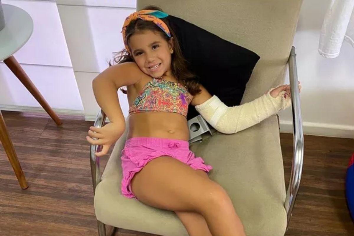 Ao ser questionada o que ocasionou a fratura de Maria Flor, Deborah teve que explicar. ”Queda boba. Brincando”, disse.