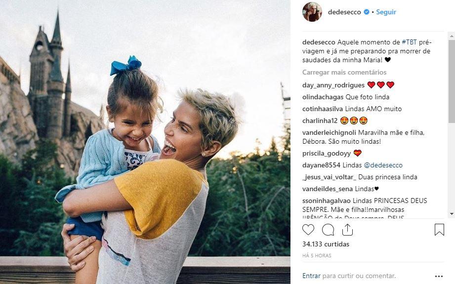 Deborah postou foto com a filha, Maria Flor, quando ambas estavam viajando para os parques da Disney, em Orlando. Os seguidores encheram a atriz e a filha de elogios nos cometários. “Que foto linda!”, disse uma seguidora. “Como a Maria Flor está crescendo rápido…”, comentou outra fã.
