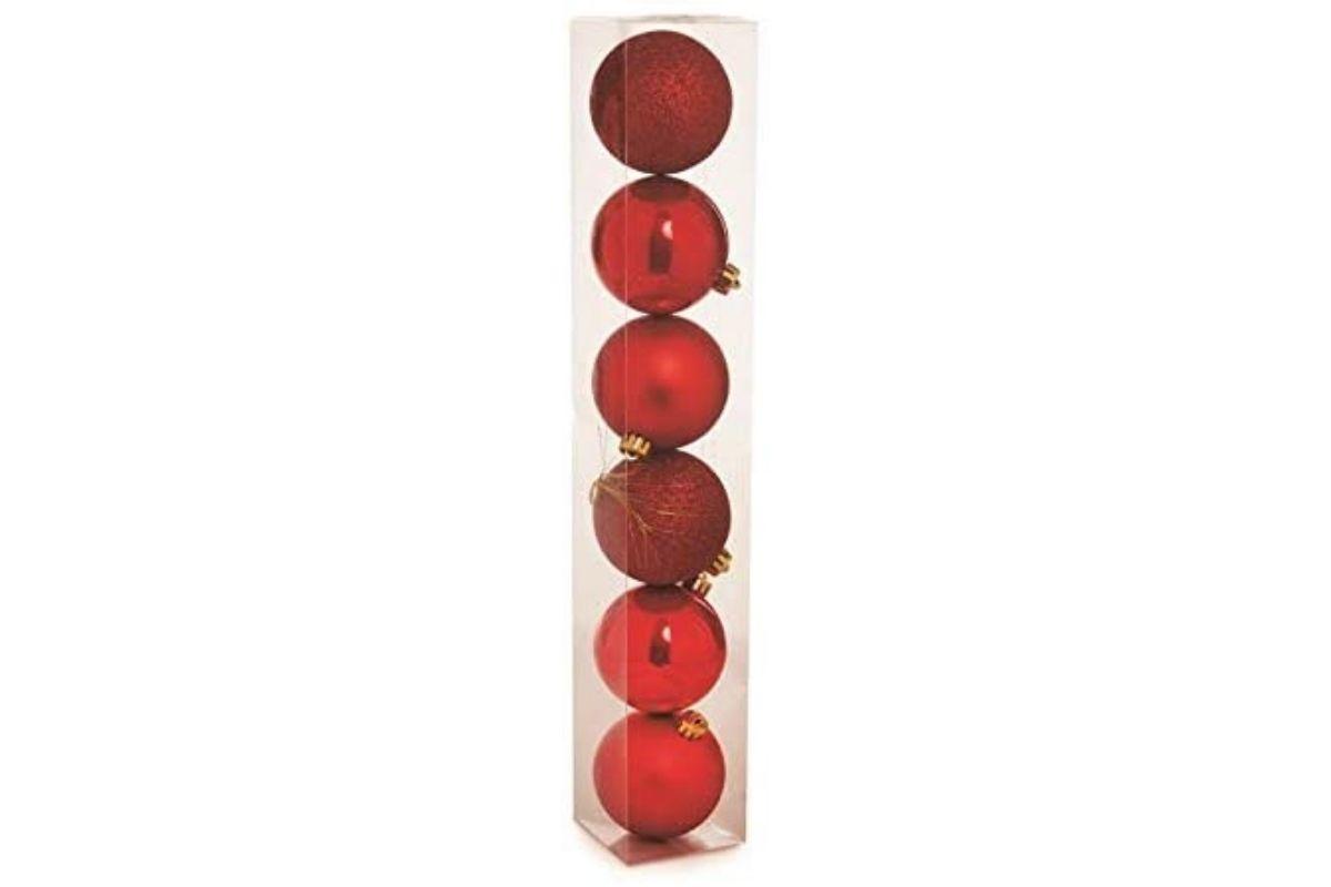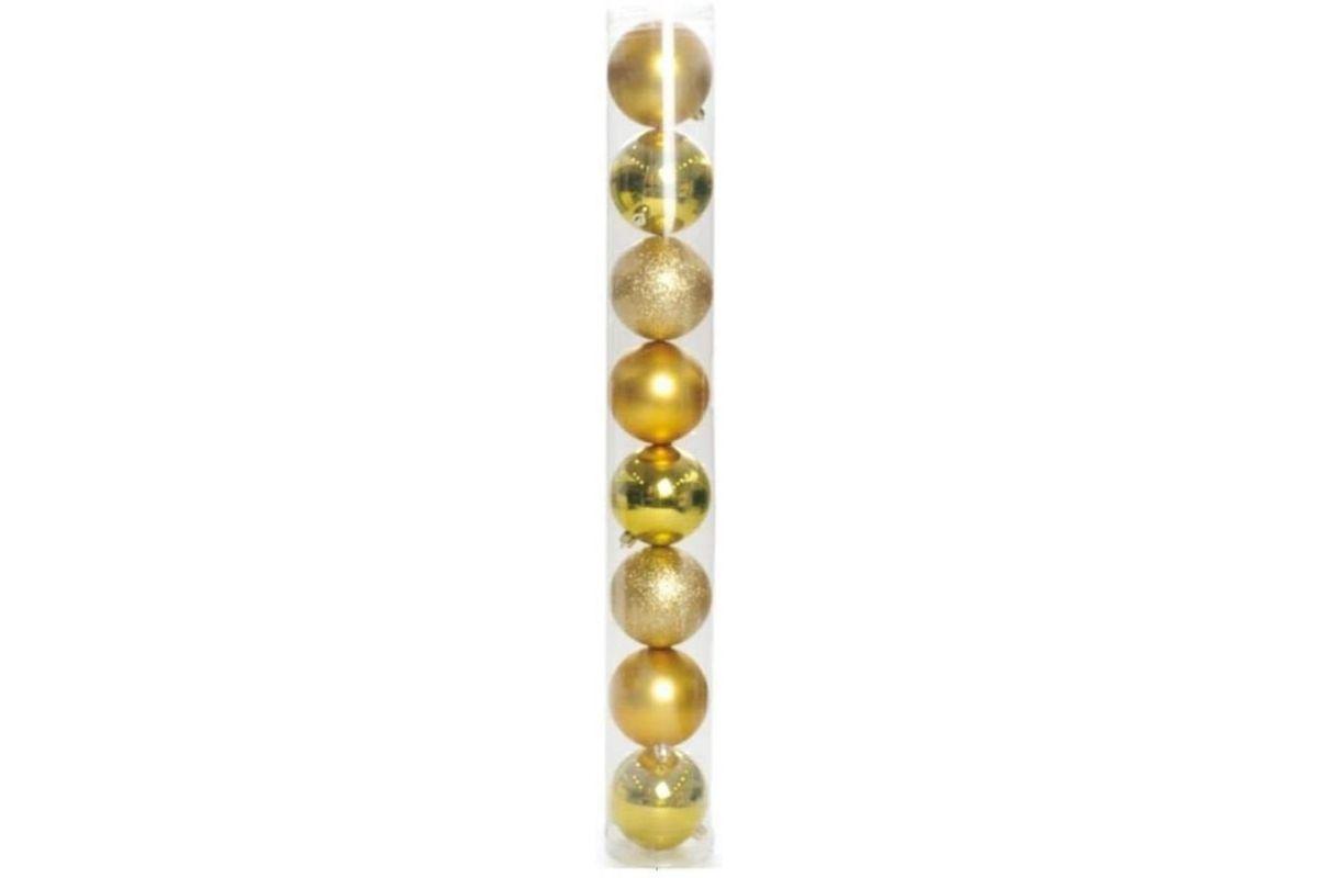 A cor dourada é a melhor para fazer par com o vermelho. Esse conjunto conta com oito bolas em três diferentes opções de tamanho, 6,7 ou 8cm.