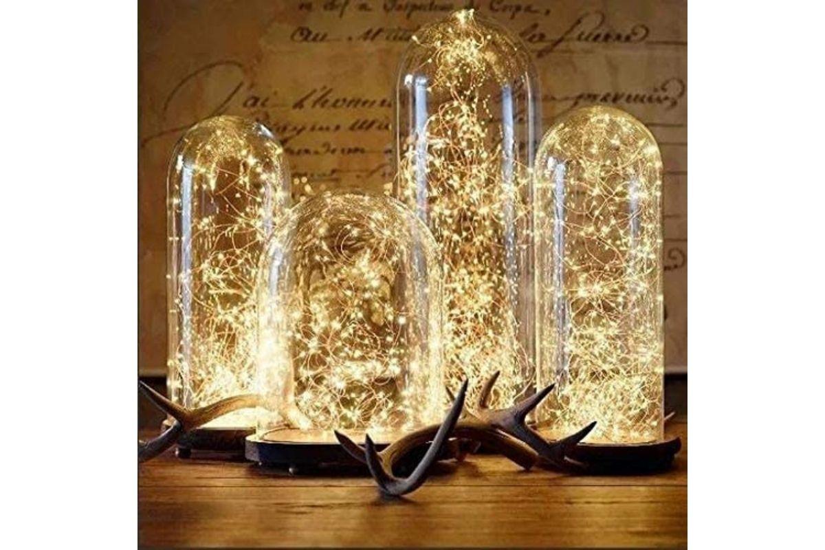 Uma opção mais delicada ao cordão pisca pisca, o fio de fada pode ser usado de várias maneiras, desde o jeito mais tradicional, pendurando pelas paredes ou estantes, até dentro de garrafas de vidro, para criar uma luminária diferente.