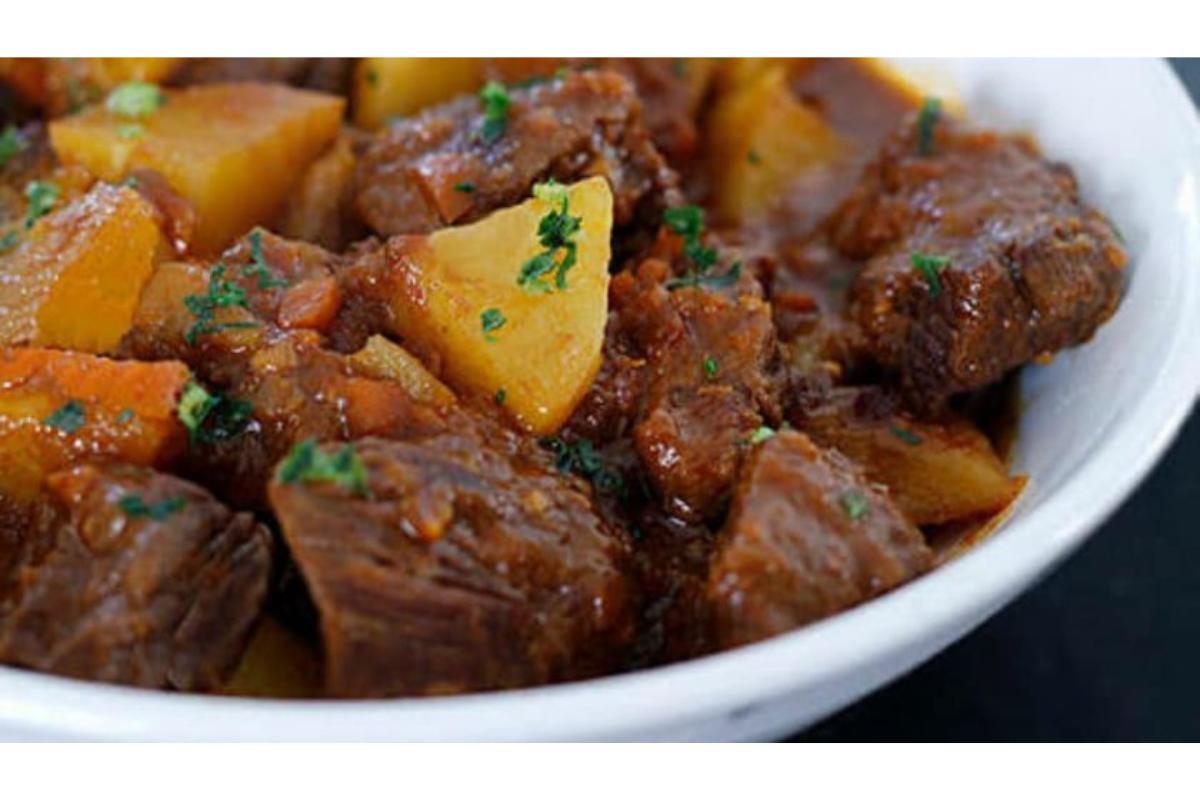 Tempere a carne com salsa, cebolinha, 4 colheres azeite, 2 dentes de alho ralado e metade da cebola ralada. Deixe na geladeira descansando 1 hora. Em uma panela de pressão coloque 6 colheres de azeite, o restante da cebola, 3 alhos inteiros e doure-os. Coloque então a peça de carne junto com o tempero que foi para a geladeira. Doure todos os lados da carne e junte o louro, o caldo de carne e água quente (até a metade da carne). Feche a panela de pressão e deixe em fogo alto até pegar pressão. Assim que a pressão começar, abaixe o fogo e deixe por 30 minutos. Passado esse tempo, desligue o fogo e espere a pressão sair. Abra a panela para colocar as batatas descascadas. Volte a pressão no mesmo procedimento alta e depois baixa por mais 30 minutos. Retire as batatas e a carne da panela e deixe apenas o caldo da carne. Deixe o líquido reduzir e engrossar. Sirva o molho com a carne.